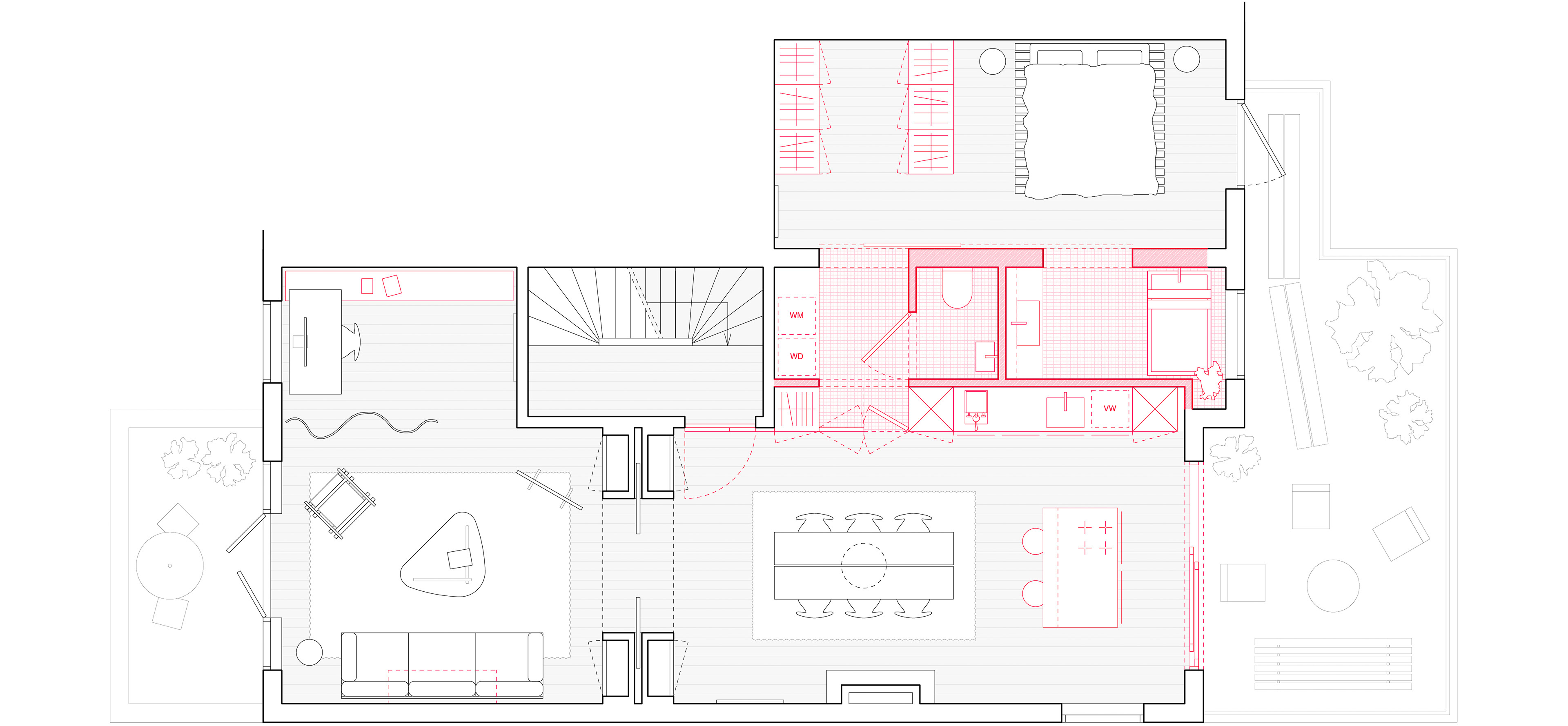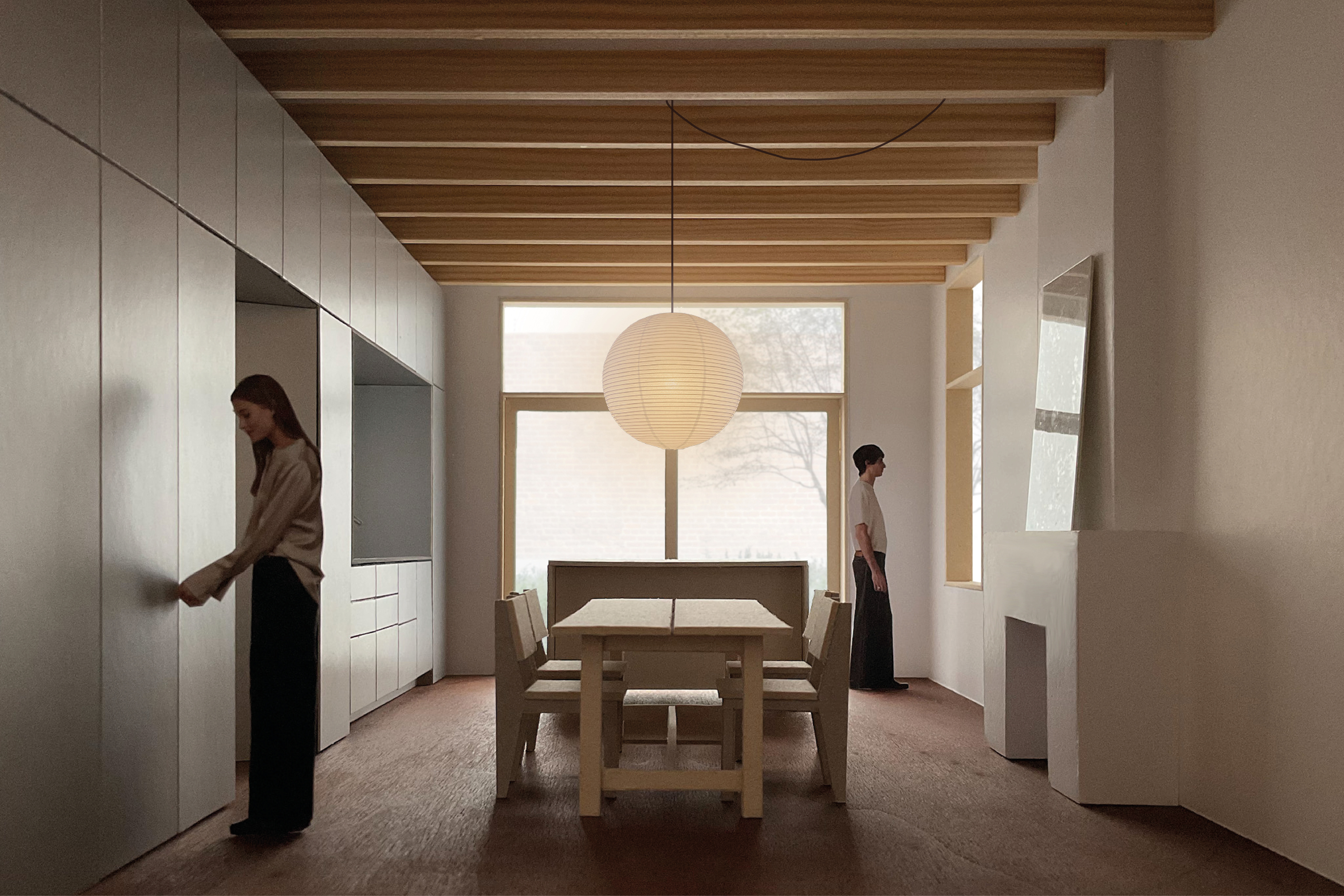 Midden in een van de mooiste wijken van Den Haag bevindt zich een appartement in een hoekpand uit 1907. Vanaf het gedeelde trappenhuis betreed je het appartement op de eerste verdieping. Na binnenkomst sluit je de voordeur achter je, die vervolgens compleet wegvalt in de wand. Een wand die zich uitstrekt over de gehele lengte van de achterkamer, bestaande uit roestvrijstalen panelen van vloer tot plafond. Dit is niet alleen de voordeur, maar ook een kastenwand, de keuken en een verborgen toegang tot het privé-domein. De interventie herverdeelt de ruimte op logische wijze en vormt zo ook de façade voor een nieuw gerealiseerde badkamer, een apart toilet en een vestibule met bijkeuken. Deze ruimtes vormen samen een natuurlijke barrière tussen de reuring van de woon- en eetkamer aan de voorkant en de rust van de slaapkamer aan de achterkant van het appartement. In the heart of one of The Hague’s most beautiful neighbourhoods lies an apartment housed in a corner building dating from 1907. From the shared staircase, you enter the apartment on the first floor. Upon entering, you close the front door behind you, a door that completely disappears into the wall. A wall that extends along the entire length of the rear room, composed of stainless-steel panels from floor to ceiling. It is not only the front door, but also a wall of cabinets, the kitchen, and a concealed passage to the private domain. The intervention reorganises the space in a logical way and at the same time forms the façade for a newly created bathroom, a separate toilet, and a vestibule with utility room. Together, these spaces create a natural buffer between the liveliness of the living and dining room at the front and the tranquility of the bedroom at the back of the apartment.